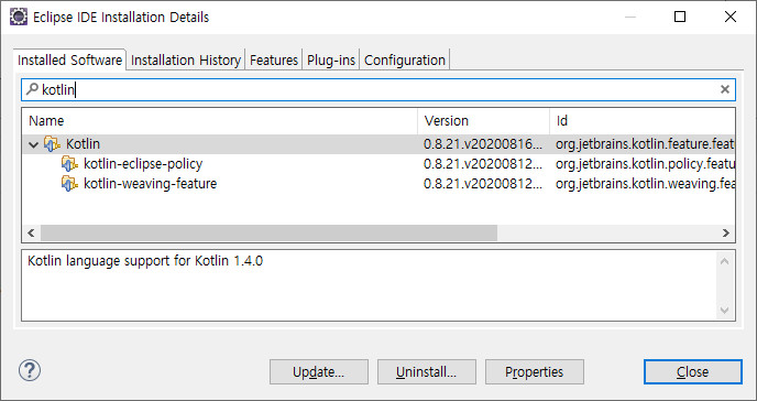 ※ Eclipse 에서 코틀린 플러그인 사용시 버전확인 방법