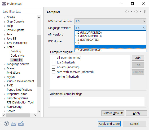 - "Window -> Preferences" 메뉴를 엽니다. "kotlin -> Complier"를 엽니다. Language version이 1.4 임을 알 수 있습니다.