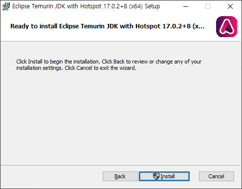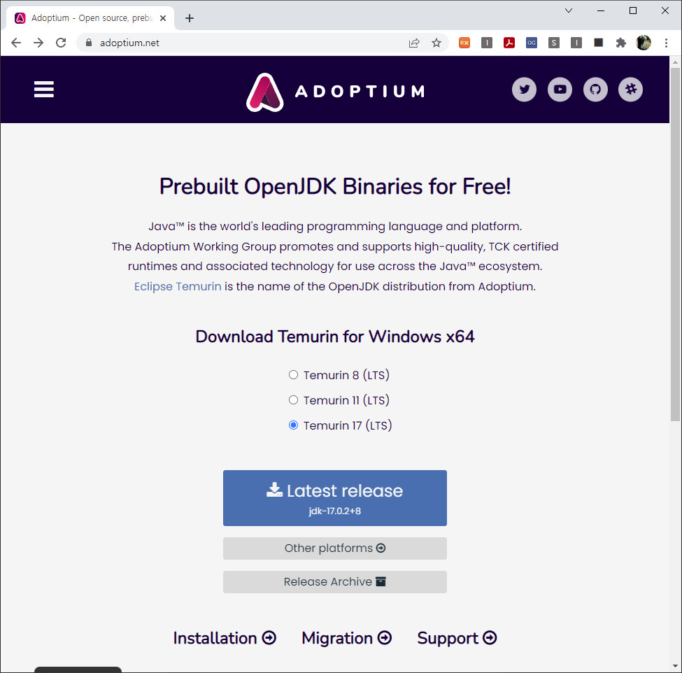 설치를 위해 다운로드 페이지(https://adoptium.net/)로 들어갑니다. 현재 최신 릴리즈인 Temurin17 (LTS)버전을 다운로드 받았습니다. 이것은 jdk-17.0.2버전 입니다. 파일명은 OpenJDK17U-jdk_x64_windows_hotspot_17.0.2_8.msi이고, 용량은 160 MB 정도 입니다.