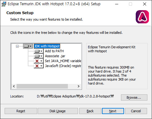 설치 위치와 환경 변수 설정을 결정합니다. 설치위치만 변경하고, 환경변수는 기본 설정 그대로 사용했습니다. 현재 제 컴퓨터에는 여러 버전의 JDK가 설치되어 있어서 JAVA_HOME등의 환경 변수는 필요에 따라 수동으로 설정 하는게 좋습니다(사실 요즘 IDE들은 자체적으로 설정을 가지게 되므로 환경변수 설정이 필요한 경우가 별로 없었습니다).
