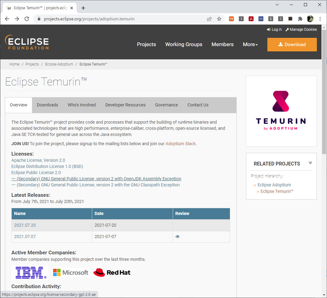 이클립스 Temurin 홈페이지(https://projects.eclipse.org/projects/adoptium.temurin)에서 관련 정보와 라이센스정보를 구할 수 있습니다. Temurin의 모든 릴리즈는 상호 운용성, 품질, 성능, 표준 준수에 대해 오라클 자바 SE TCK(Technology Compatibility Kit)와 이클립스 AQAvit 테스트를 통과했다고 합니다.