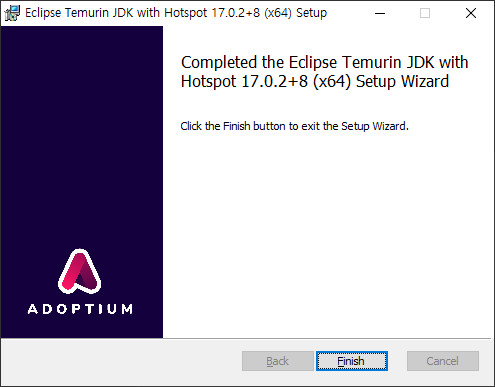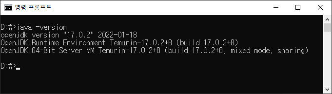잘 설치가 되었습니다. Adaptium사이트 메인화면에서 JDK 버전 8, 11, 17 버전을 바로 다운로드 받을 수 있게 되어 있었습니다. 필요한 버전을 다운 받아 사용하면 되겠습니다.