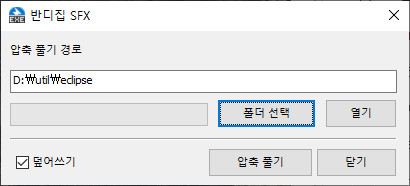- 압축을 풀 폴더를 선택하고, "압축풀기"를 눌러 설치합니다. 개발환경은 원하는 폴더에 압축을 풀면 설치가 끝납니다. 여기서는 D:\util\eclipse 폴더를 만들어서 선택했습니다. 압축을 풀면 이 폴더 아래에 eGovFrameDev-4.0.0-64bit 폴더가 생성됩니다.
