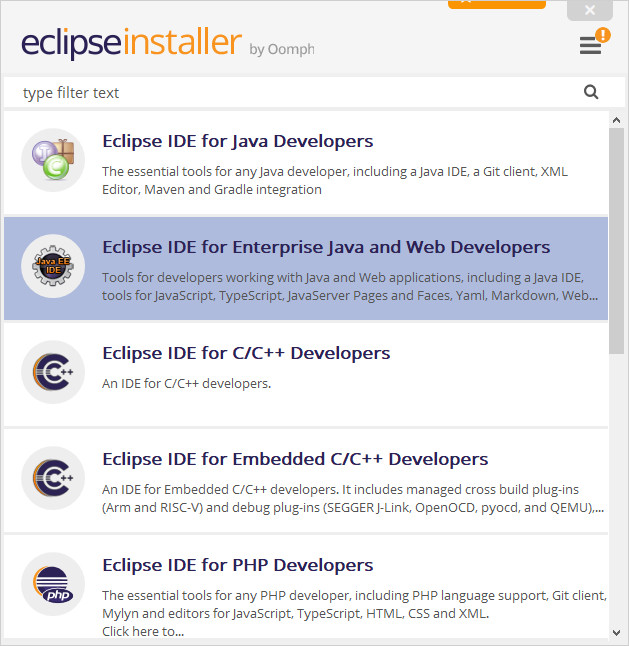 - 설치프로그램을 더블클릭해서 실행합니다. 이클립스는 소프트웨어 개발에 사용할 수 있는 많은 프로그래밍 언어를 지원합니다. 여기서는 "Eclipse IDE for Enterprise Java ans Web Developers"를 선택해서 자바 웹개발에 필요한 기능을 설치합니다. 다른 기능들도 설치후에 플러그인을 추가로 설치하여 사용할 수 있습니다.