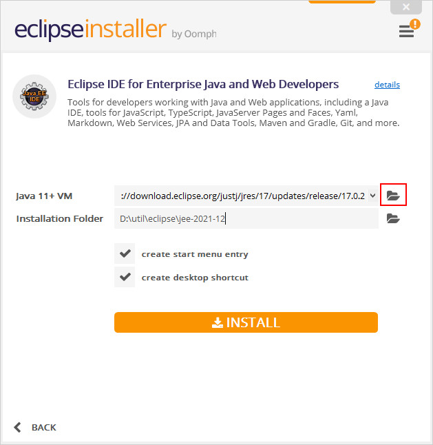 - Java VM과 설치 위치를 선택하는 화면 입니다. 설치 위치는 "D:\util\eclipse\jee-2021-12"로 하였습니다. VM을 선택하기 위해서 VM 옆의 폴더 모양 아이콘을 누릅니다.