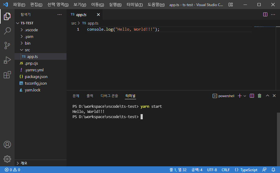 - 프로젝트 폴더는 자신이 원하는 곳에 만들면 됩니다. 저는 vscode 프로젝트들을 D:\workspace\vscode 폴더 아래에 모아뒀습니다. 그러므로 작업용 프로젝트를 저장할 폴더를 D:\workspace\vscode\ts-test라고 만들었습니다.