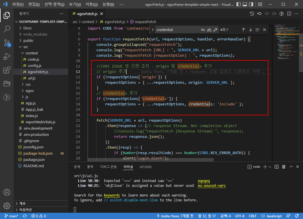 - CORS 대응과 쿠키 사용을 위해 정의된 부분입니다. "src/context/egovFetch.js" 파일의 "requestFetch()" 함수에 정의되어 있습니다.
