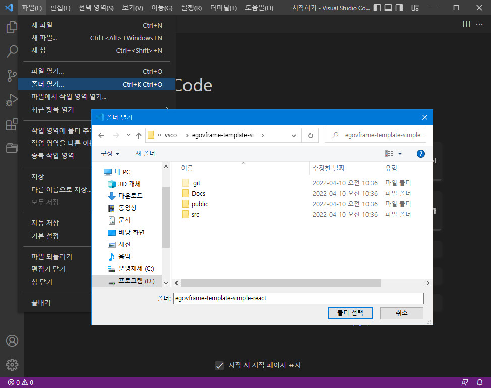 - VScode를 실행하고 메뉴에서 "파일 -> 폴더 열기..."를 선택해서 생성된 프로젝트 폴더를 선택합니다.