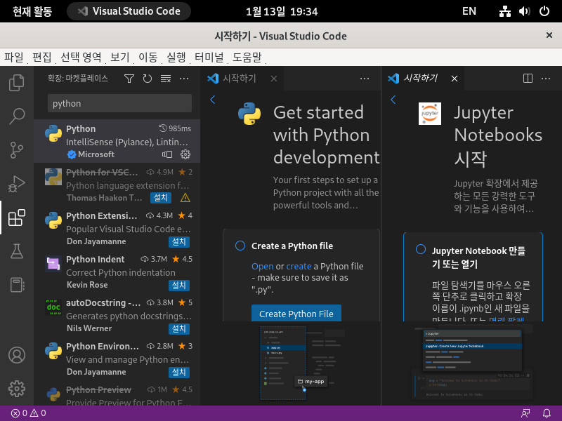 Python확장이 설치되었습니다. 시작하기 화면이 두개 표시되었는데, 하나는 Jupyter Notebooks에 관한 내용입니다. Microsoft Python확장을 설치하면 자동으로 Jupyter Notebooks 확장도 설치됩니다.