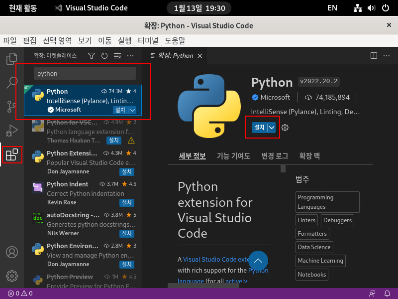 Python이 설치되어 있으므로 Visual Studio Code에 Python 확장을 설치합니다. Visual Studio Code를 실행하고, 왼쪽 메뉴바에서 확장 아이콘을 클릭하여 마켓플레이스를 열고 python으로 검색합니다. 검색된 확장들 중 Microsoft에서 나온 Python 확장을 설치합니다.