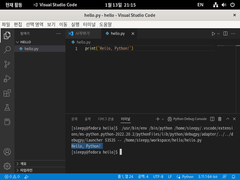 리눅스 Fedora 37에 설치된 Microsoft Visual Studio Code에서 Python을 사용해 보겠습니다.